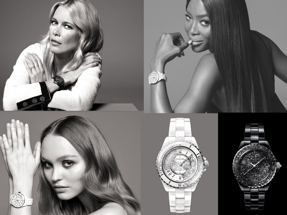 En 2003, passant du noir corbeau au blanc pur, elle fait mouche avec sa robe de céramique blanche de 38 mm ou 33 mm de diamètre. Deux ans plus tard, la version tourbillon vient mettre une vraie touche de design dans la J12. En 2007, elle devient plus ingénieuse avec l’apparition d’un second fuseau horaire. 2009, retour au black intense et au savoir-faire exceptionnel des ateliers suisses avec la transformation inédite d’un bloc de céramique pure en 724 baguettes de lumière noire. Une montre collector, puisque seulement 5 exemplaires ont été proposés. 2010 marquera l’avènement du « sporty chic » avec la J12 Marine étanche à 300 mètres et parée d’un bracelet en caoutchouc. L’année d’après, place à la version titane dont l’effet miroir lui confère une allure surréelle. En 2013, Chanel fait sensation avec le modèle lunaire « Moonphase » qui scintille avec son bleu profond pailleté. La brillance se poursuit l’année suivante avec la version bling bling de la J12 recouverte de diamants baguettes et au bracelet scintillant. En 2016, la sobriété est de retour avec la version en cuir miniature de 19 mm de diamètre. Imaginée par Arnaud Chastaingt, le nouveau directeur du Studio de la création de l’Horlogerie, la J12∙XS séduit pour son mini format et bracelet classique en céramique. En 2017, créativité oblige, la montre s’offre Mademoiselle Chanel en guest-star dans son cadran qui agite ses bras pour donner l’heure. L’année d’après, Chanel fait les choses en grand et met en scène un coffret spécial composé de 12 montres exclusives en marqueterie de céramique. L’année dernière, surprise totale, la J12 fait peau neuve et s’offre un lifting complet : lunette affinée, gouges augmentés, chiffres redessinés, couronne plus fine, boîtier plus volumineux… Enfin, le meilleur pour la fin bien entendu, cette année, la J12 fait son come-backs en grandes pompes avec une version noire, blanche et une dernière toute en transparence. Plus chic et audacieuse que jamais, elle s’offre une petite touche excentrique qui ne manquera pas de séduire les fans de la marque. En effet, elle met en avant 20 symboles et références de Chanel : un sac 2.55, un camélia, un flacon de parfum N°5 ou encore une veste en tweed. Ses motif polis et rhodiés s’invitent aussi bien sur sa lunette que sur son cadran. Arnaud Chastaingt dévoile donc la J12.20, sublimée de 12 diamants répartis sur son cadran, disponible en édition limitée et portant la mention « 20 YEARS. LIMITED TO 2020 » gravée sur le fond du boîtier. Et pour fêter en beauté son 20ème anniversaire, la griffe a lancé une grande campagne regroupant ses plus célèbres égéries, à l’instar de Lily-Rose Depp, Claudia Schiffer, Naomi Campbell ou encore Ali MacGraw.
