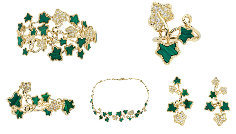 Il s’agit de la nouvelle collection de haute joaillerie baptisée « Leaves of Love » et imaginée par Victoire de Castellane, la directrice artistique de Dior. Ces nouvelles créations raffinées renouent avec le lierre demeurant un emblème cher au fondateur de la maison. Sur un collier, une manchette, une paire de boucles d’oreilles et deux bagues, les branches du lierre s’entrelacent et sont revisitées en or jaune. Aussi, les feuilles sont serties de malachite verte, ou se composent d’un granulé d’or parsemé de diamants. Ces courbes dansantes sont sublimées par de minutieux ourlets d’or nervurés encadrant les feuilles de lierre et leur offrant un écrin plein de poésie.