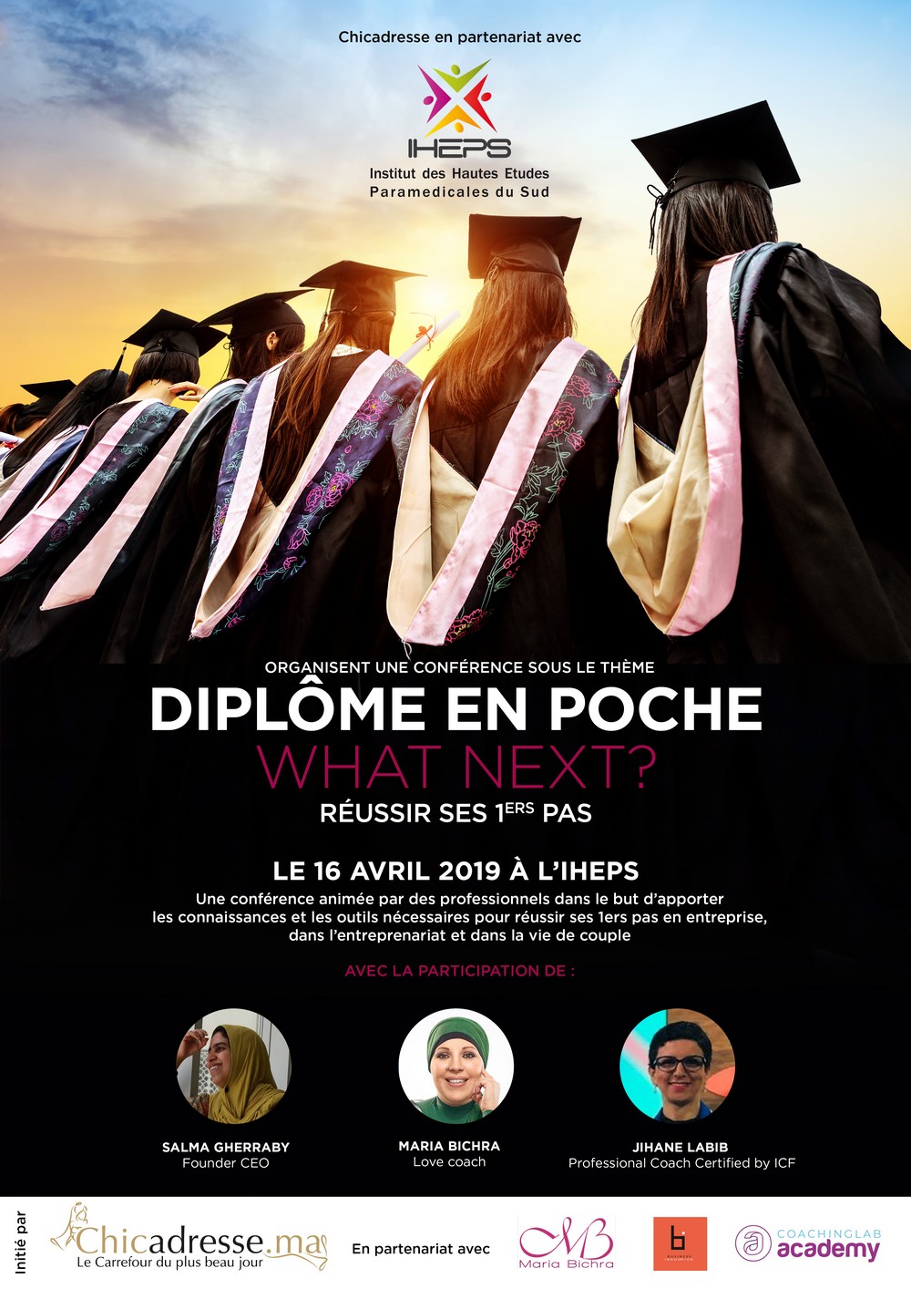 Les choix que les étudiants feront après avoir quitté les bancs de l’école seront déterminants sur leur avenir. Leurs décisions impacteront leur projet professionnel, leur épanouissement personnel, leur vie de famille…Sont-ils alors outillés pour prendre les bonnes décisions? Tel est le grand débat lancé par Chicadresse.ma en partenariat avec I’IHEPS Casablanca, qui organisent une grande conférence mardi 16 avril prochain à partir de 14h. Elle sera animée par des experts dans le but d’apporter les connaissances et les outils nécessaires pour réussir son projet professionnel et son projet de vie. Sous le thème « Diplôme en poche : what next ? Réussir ses 1ers pas », cette intervention s’adresse aux écoles supérieures et universités. Pour enrichir les échanges, étudiants, professeurs et corps administratif y sont cordialement conviés. Objectif : donner envie aux jeunes d’entreprendre, de réussir leurs projets, les sensibiliser pour trouver le bon équilibre entre carrière professionnelle et vie privée. Rappelons que Chicadresse est une plateforme digitale qui a acquis plus de 5 ans d’expériences dans l’accompagnement et le conseil des couples. Ainsi, plusieurs experts viendront enrichir la conférence de leurs connaissances et apporter leurs conseils avisés. Notamment Jihane Labib, fondatrice et directrice de Coachinglab - Academy depuis 2012, coach certifié par l’International Coach Federation et formatrice certifiée aux Emirats Arabe Unis en développement personnel. Mais aussi Maria Bichra, coach de couple certifiée et fondatrice de Planète Maman Bébé, qui lui a valu le titre d’«icône des mamans». Très connue dans le paysage médiatique marocain, elle a été aussi nominée « Femme entrepreneure de l’année 2008 ». Et enfin la conférencière et consultante Salma Gherraby qui a représenté le Royaume au Pan-Arab au Qatar lors de la compétition de l’IMAGINE CUP, dont elle est d’ailleurs championne 2014 Maroc. Aujourd’hui, elle se consacre idéalement à son cabinet de conseil « Business Innovation ». Cette année, elle va représenter le Maroc lors de l’«Advanced Program Entrepreneur Simulator» à la silicone Valey dont elle est boursière.