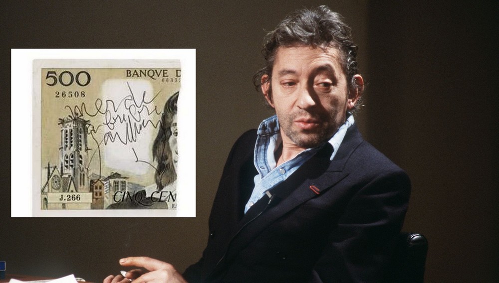 Souvenir indélébile : le légendaire provocateur Serge Gainsbourg avait scandalisé l’opinion publique en brûlant en live à la télé un billet de 500 francs, sur TF1 en 1984, pour dénoncer le « racket des impôts ». Si cette scène mythique avait alors marqué les esprits, elle revient plus que jamais au goût du jour. Gainsbarre avait déchiré un autre billet de 500 francs en 1988, dont il avait dédicacé la moitié et offert à une amie. Mardi dernier, à Paris, la Maison Sotheby's en a profité pour le mettre en vente aux enchères. Certes, malgré l'engouement en salle, ça n’a pas rapporté la somme espérée, mais le billet a tout de même été adjugé à 5000 euros. L’identité de l’acheteur n’a pas été dévoilée.