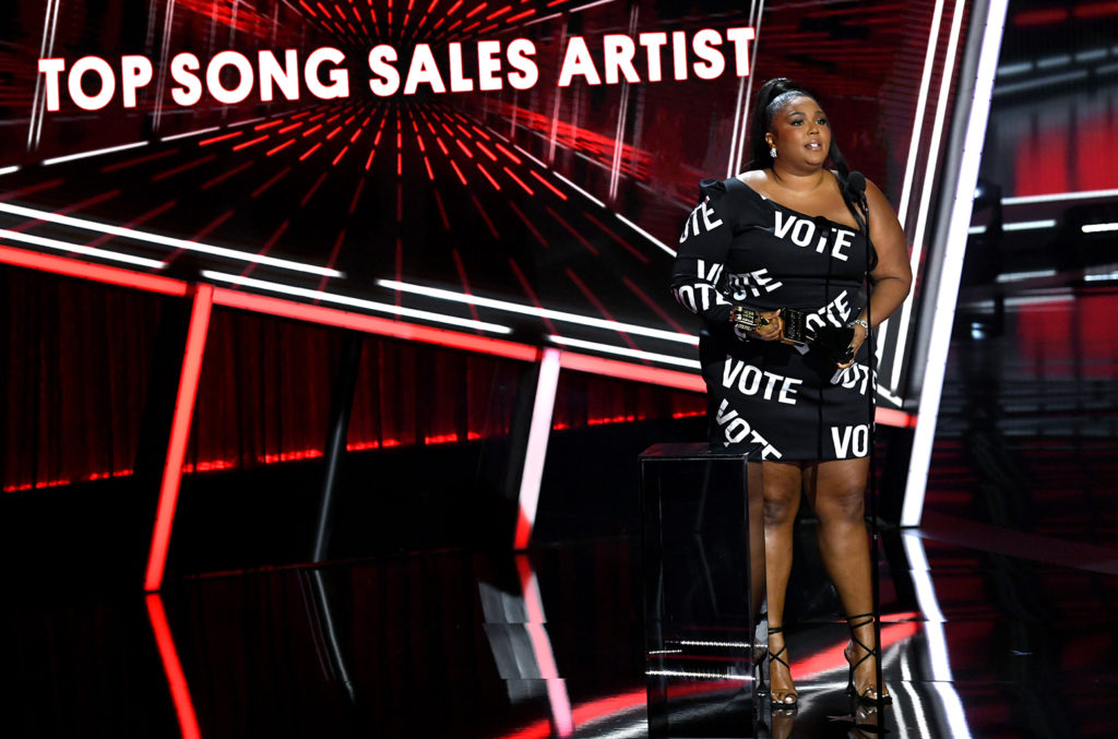 Lizzo dans sa mini-robe avec "vote" écrit dessus