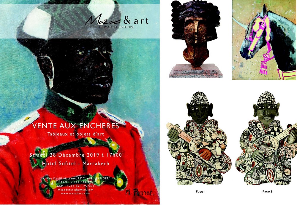 Ce samedi 28 décembre, à 17h, ne manquez surtout pas cette sublime vente aux enchères d’hiver en plein cœur du Sofitel Marrakech. Organisée par la Maison Mazad & art et conduite par Maître Alexandre Million (Maison parisienne Millon), cet événement promet de ravir bien des collectionneurs et amateurs d’art. Très riche et diversifiée, la vente mettra en scène 178 lots, signés de près d'une centaine d'artistes de grande renommée. Au programme : des dessins et des toiles de « Marocanistes » (orientalistes passionnés par le Maroc d'antan), des peintures et sculptures d'artistes nationaux de la période dite moderne (de l'indépendance aux années 1980/90), ainsi que toute une large sélection d’œuvres de plasticiens marocains dits singuliers (jadis faussement désignés de « naïfs »). Et ce, à des prix de départ particulièrement raisonnables. Petit aperçu, non exhaustif naturellement, du catalogue : le maître incontesté de la peinture « Marocaniste », Jacques Majorelle, sera représenté par six estampes sur carton, rehaussées d'or et d'argent. Des estampes exceptionnelles extraites de la même série que celle que l’on peut admirer au Musée Slaoui à Casablanca. L'autre valeur mondialement incontestée de l'art « Marocaniste », Edy-Legrand (1892-1970), sera également à l’honneur avec une toile faustive haute en couleurs représentant un « Troupeau de campement » (45 x 48 cm), mais également par une dizaine de ses dessins à main levée, rehaussées de touches de gouaches polychromes, caractéristiques de l’artiste. Ces magnifiques œuvres ont été exécutées autour des années 1930, dans les régions de Zagora et Goulmim. Vous découvrirez encore la fameuse « Vue du souk » de Pontoy (1888-1968), ce « petit maître » à la palette et aux sujets aussi discrets qu'appréciés des amateurs avertis. Sujet plus rare : une gracieuse odalisque marocaine du même peintre devrait en ravir beaucoup. A l’honneur également, Marvel Perrot (fin XXe) avec un saisissant portrait d'un « Garde noire du Sultan » (huile sur toile, 41 x 32) qui sera sûrement âprement disputé. Autre œuvre phare qui ne passera pas inaperçue : le portrait d’une « Jeune femme au turban », d'André Suréda (1872-1930). À mi-chemin de la peinture orientaliste et de la peinture marocaine moderne, un Hassan El Glaoui (1924-2018) dont il est inutile de vanter les éblouissantes et si élégantes chevauchées, sera également au rendez-vous. Plus rares en salle de vente : quelques petites gouaches anciennes de Hamidi (1941). En parlant d'artistes marocains de la première heure, retenons également cette très intéressante et assez rare technique mixte sur papier marouflé, signée Houcine Tallal datant de 1967. D'autres artistes modernes marocains seront aussi représentés, à l’instar de Saâd Ben Cheffaj (1939), avec des dessins, des peintures, et même des sculptures en bronze. Un bon nombre d'œuvres de Mohamed Drissi (1946-3003) feront le bonheur des amateurs de ce peintre figuratif expressionniste si marquant. Outre l'incontournable Chaïbia (1929-2004), avec une belle huile sur toile, vous découvrirez encore deux petites gouaches sur papier du très délicat Ben Allal. Sans oublier un somptueux Saladi (1950-1992), deux pièces, dont un triptyque d'Ahmed Louardighi (1928-1974), datant du début des années 1960, ou encore bien d’autres œuvres d'artistes dits singuliers qui feront sans nul doute le bonheur des amateurs. Vous l’aurez compris, cette vente s’annonce très prometteuse !