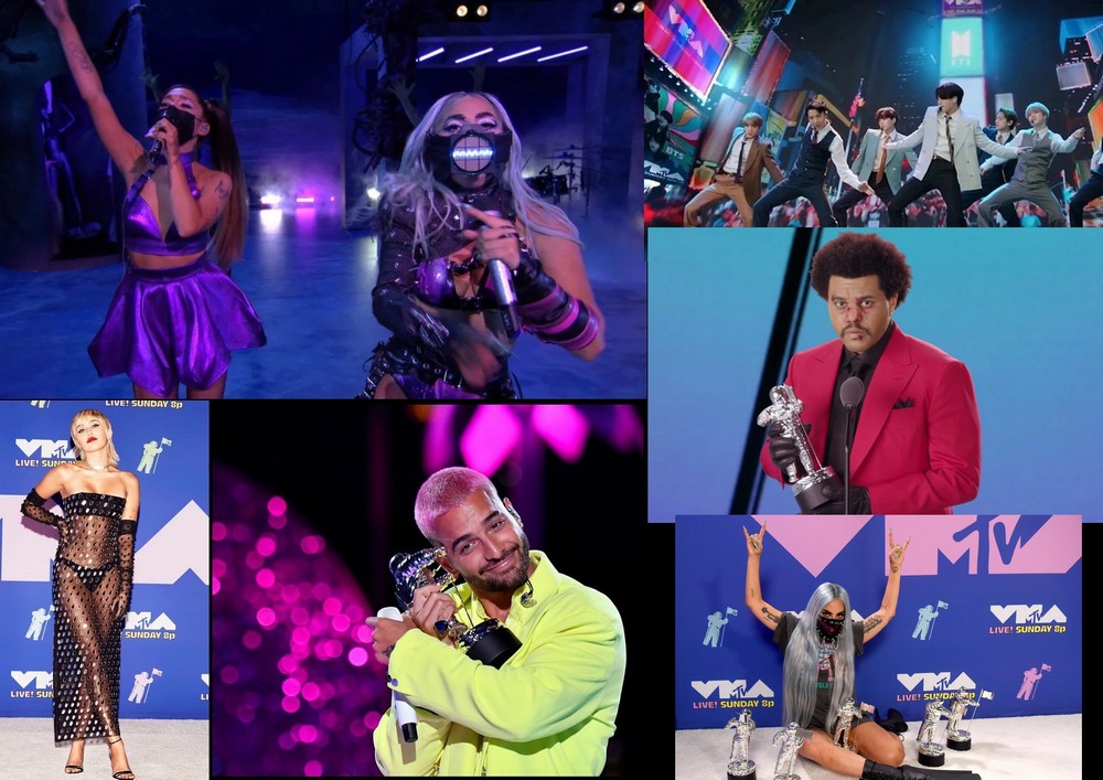 Dimanche 30 août, malgré la pandémie de Covid-19, l’édition 2020 des MTV Video Music Awards a bien eu lieu à New York en live et en partie virtuelle. Une cérémonie haute en couleurs et en surprises, avec un nombre limité de stars, pour récompenser les meilleurs clips de l’année. Mais exceptionnellement cette année, coronavirus oblige, la soirée ne s’est pas déroulée dans une salle close : les nominés ont eu l’occasion de se représenter dans des scènes différentes agencées dans divers lieux de la ville, restés secrets pour éviter la foule. Figure emblématique de la soirée : Lady Gaga, bien entendu, qui a carrément porté la cérémonie en offrant un spectacle de haute-voltige. 100% masquée, elle a joué la carte de l’extravagance et de l’exubérance à fond avec des looks démentiels à la sauce rétro-futuriste. En duo avec la superbe Ariana Grande, également masquée pour l’occasion, leur titre « Rain on me » (chanson de l’année) a mis le feu sur scène. Récompensé et très ému, The Weeknd s’est démarqué des autres en se dévoilant le visage tuméfié comme dans son clip et en réclamant justice pour les victimes noires de la répression policière, Jacob Blake et Breonna Taylor. « C’est vraiment difficile pour moi de célébrer ça maintenant et de profiter de ce moment, alors je vais juste dire justice pour Jacob Blake, justice pour Breonna Taylor. Je vous remercie », a-t-il déclaré en recevant sa statuette. Il nous aura aussi donné quelque peu le vertige en chantant du haut de la South Tower, perché à près de 200 mètres au-dessus de la terre ferme. Miley Cyrus a également fait sensation en se balançant sur une boule à facettes géante pour recréer l’ambiance de son clip de « Wrecking ball ». N’oublions pas non plus les performances exceptionnelles des BTS, Doja Cat, Maluma ou encore CNCO. Moment phare : le medley endiablé de Lady Gaga qu’on n’oubliera pas de sitôt. Lady Gaga en a profité pour adresser un message à ses fans : « Je veux que vous vous aimiez ce soir et tous les soirs. Célébrez-vous. Aimez qui vous êtes. Soyez bon. Portez un masque. Soyez courageux et les plus courageux tout le temps. » Même sans public, la superstar, qui a été sacrée artiste de l’année, a prouvé qu’on pouvait s’éclater sur scène : multipliant les tenues et les prestations, sur fond psychédélique de son album Chromatica, Lady Gaga était juste sensationnelle. A coup sûr, cette édition inédite des MTV VMA 2020 restera dans les annales.