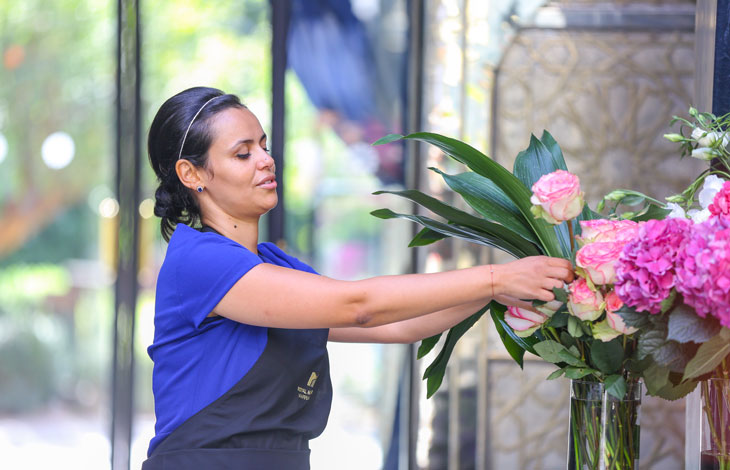 Les fleurs, ce sont d’abord des noms qu’on essaie de retenir et qu’on aime à répéter : bégonias, hortensias, amaryllis... Et ces multiples noms de roses, Royale gros boutons, rose royale Baccara, rose Amadeus... Des ciseaux, de la mousse, un vase, des fleurs et des perles suffisent à me donner la sensation d’être à nouveau une enfant qui se laisse aller à son émerveillement. Imane Oulaali, talentueuse et souriante directrice artistique du Royal Mansour, créatrice des belles compositions florales du lieu, initie et suggère au cours de l’atelier floral des idées d’embellissement des bouquets. Quelques perles et la composition florale devient décor festif. Arrangement minimaliste et la sculpture végétale devient design. Des astuces et des indications précises sur l’équilibre des compositions nous ont permis à toutes en un temps très court d’apprendre les rudiments de l’art floral.